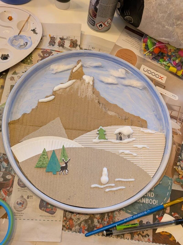 We toveren een deksel van een oude verfpot om tot een echt winterlandschap. We werken met texturen en puf paint.