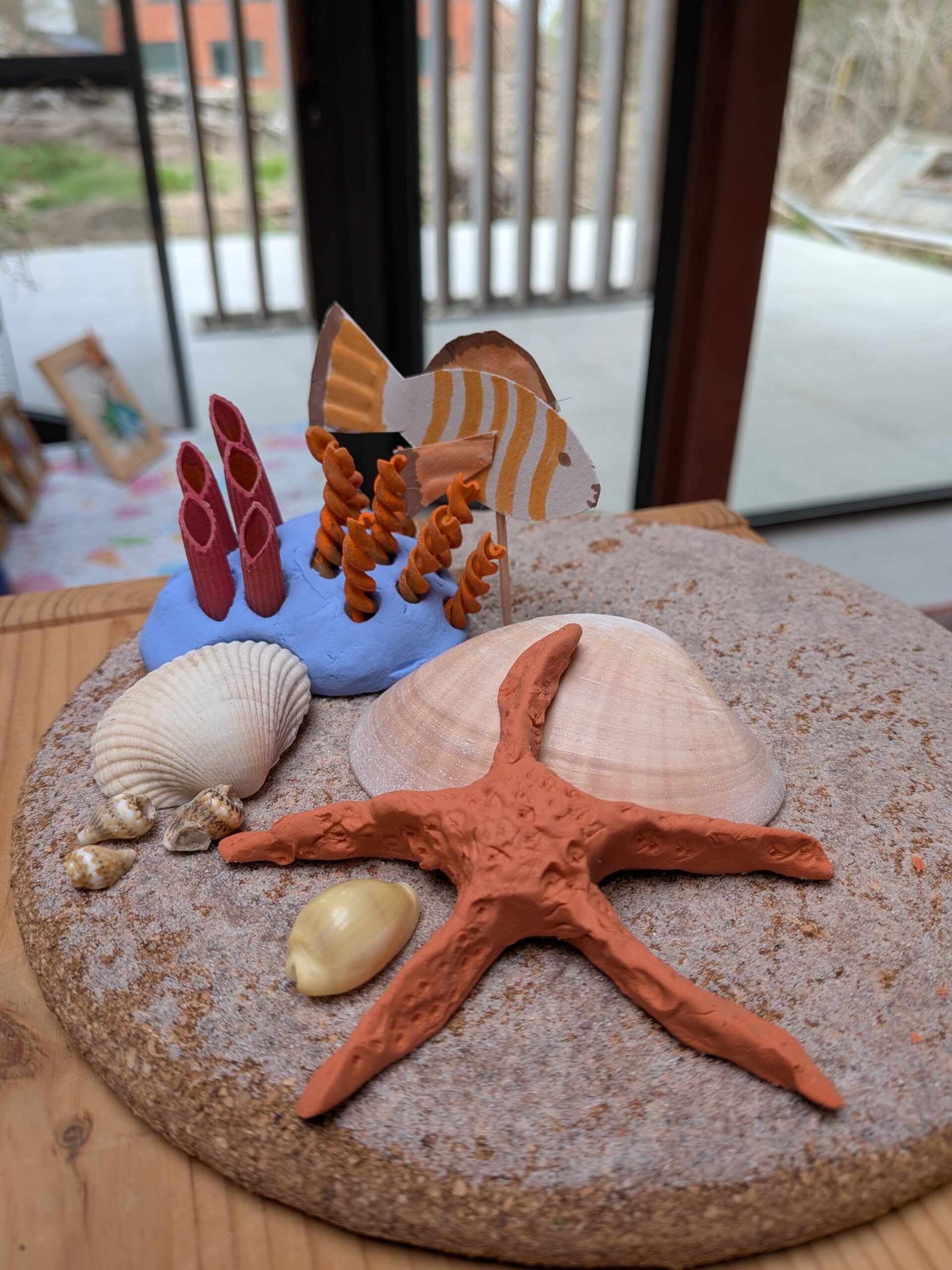 We creëren onze eigen onderwaterwereld! Dit doen we met uiteraard met zand en schelpen , maar ook klei, karton en pasta!